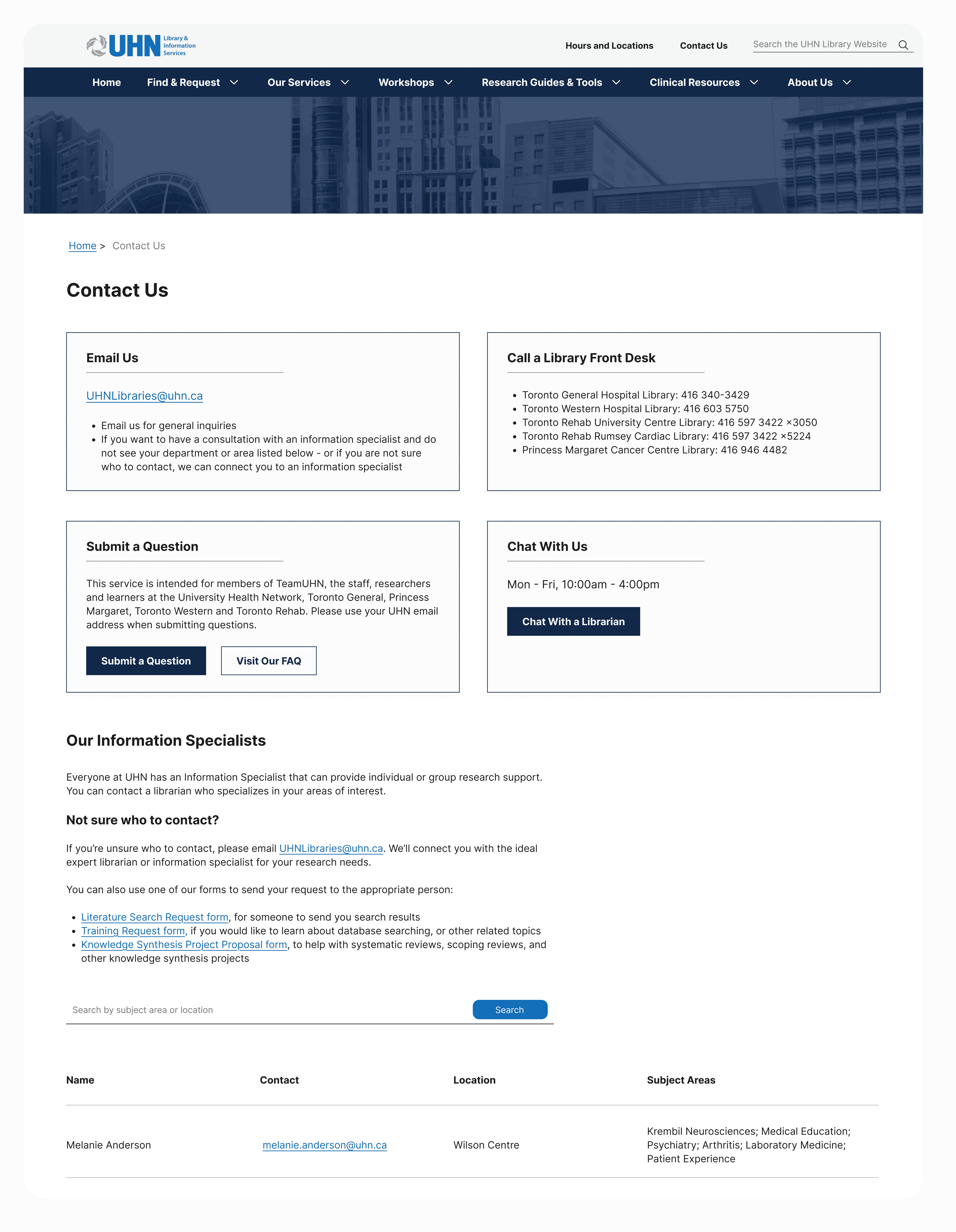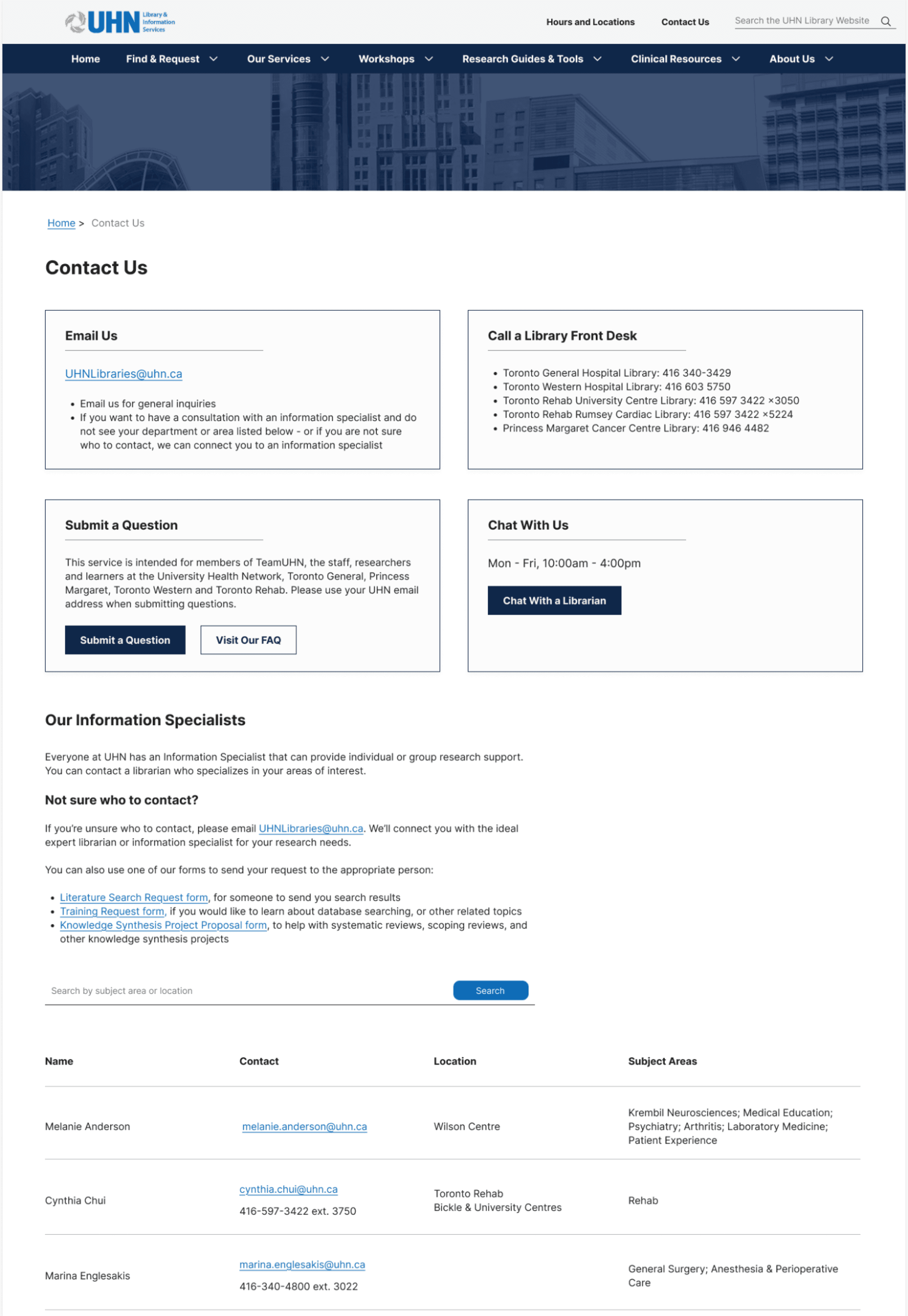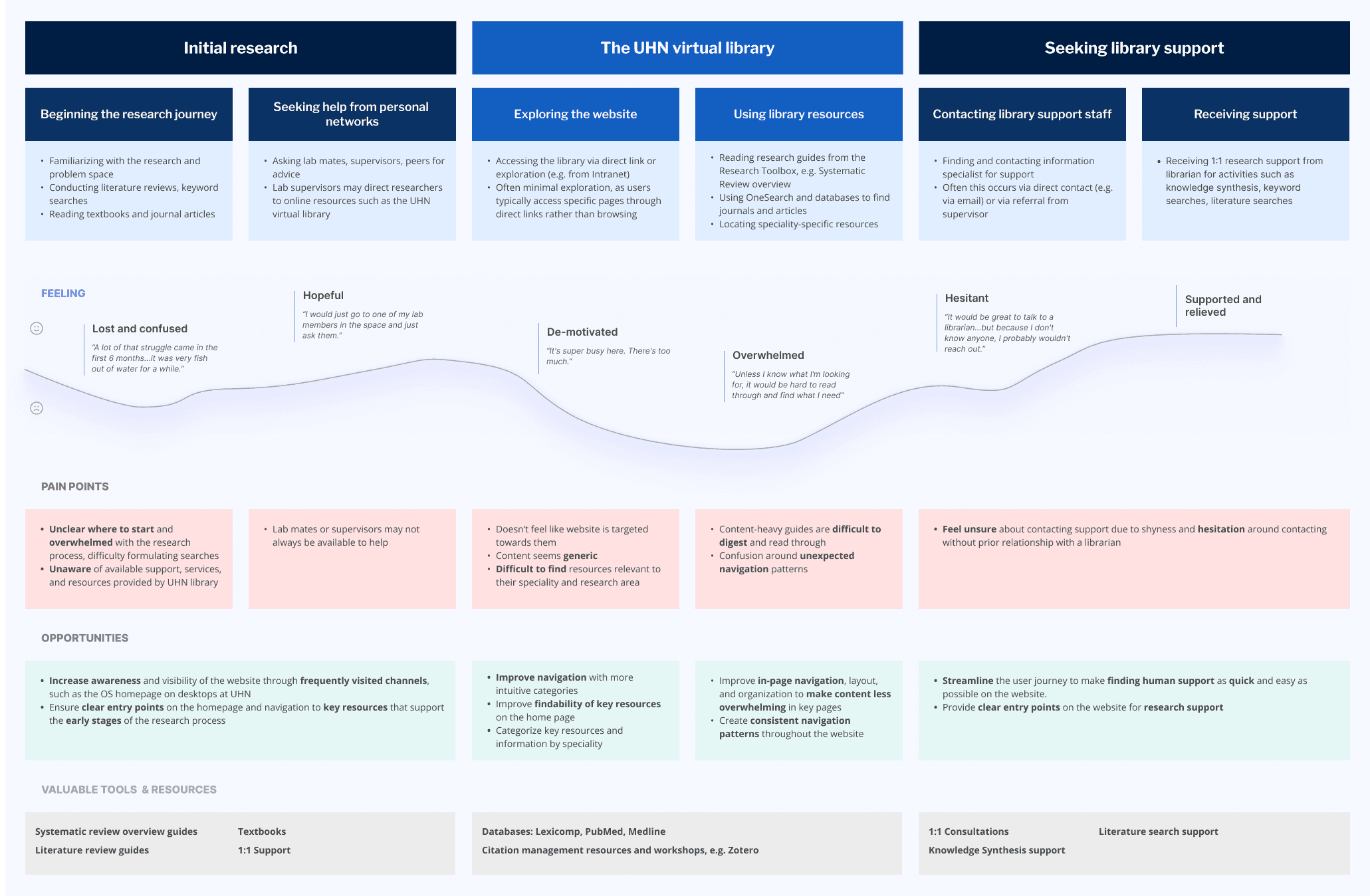 We interviews UHN researchers and clinicians. The first part of the session was a semi-structured interview where participants reflected on their experiences with seeking support during their clinical and research journeys. In the second half, we did light usability testing by providing users with tasks to complete on the current website, such as finding contact information, using research guides, and locating clinical tools.