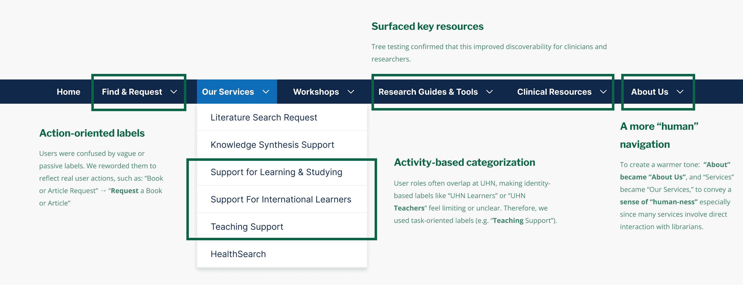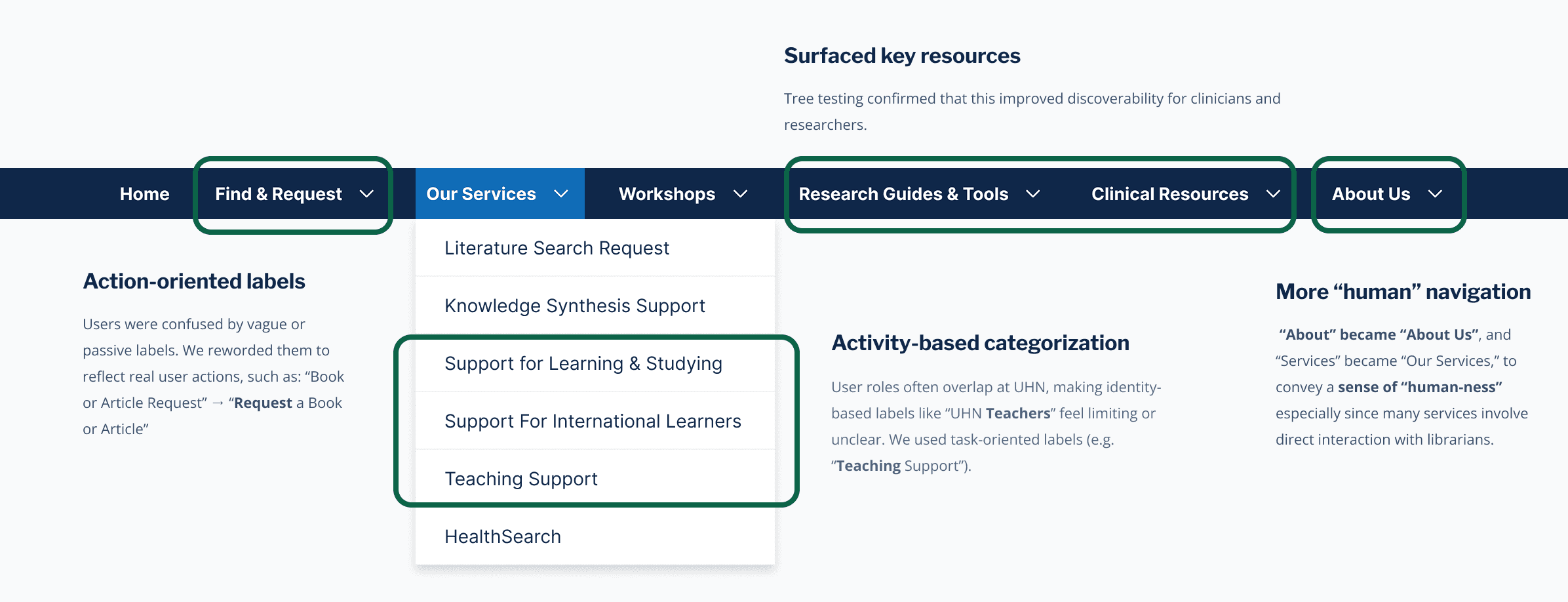 Based on these insights, we restructured the site’s navigation. In subsequent usability testing round, users achieved an 92.5% task success rate with the improved navigation. Some changes include: